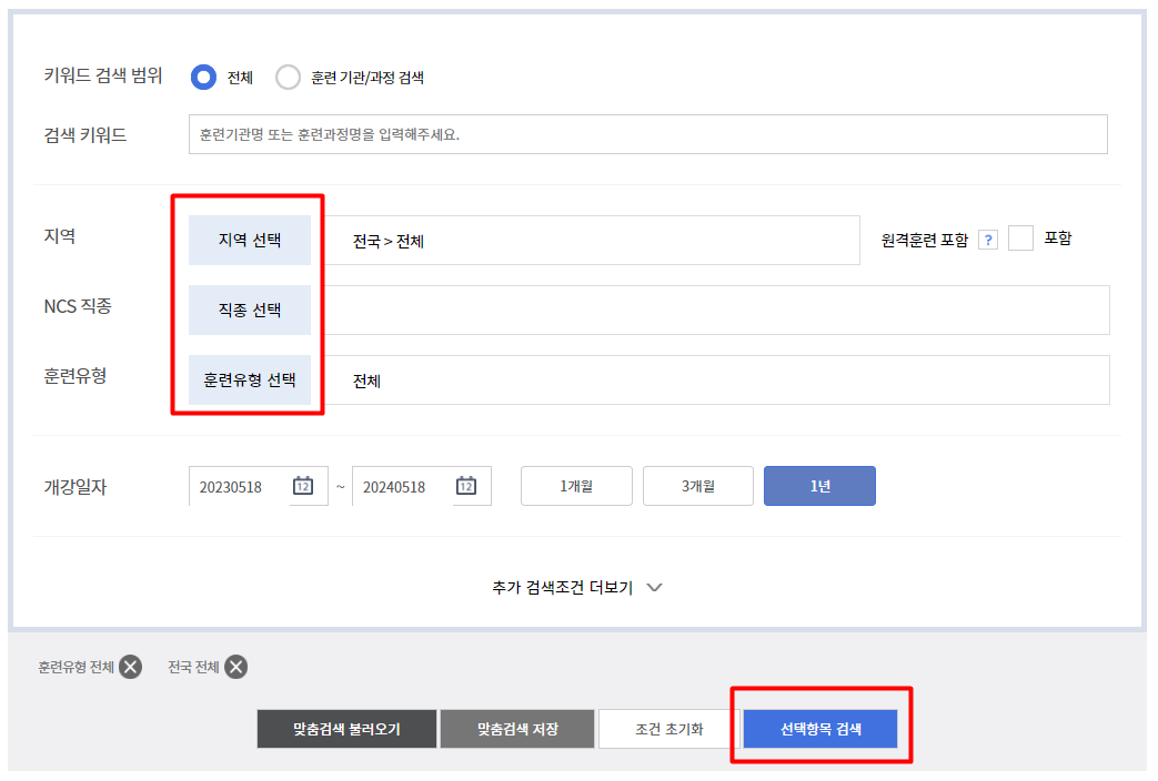 자신의 지역과 직종, 훈련 유형등을 확인한 후 선택 항목 검색을 통해 내일배움카드 사용처를 확인할 수 있습니다.