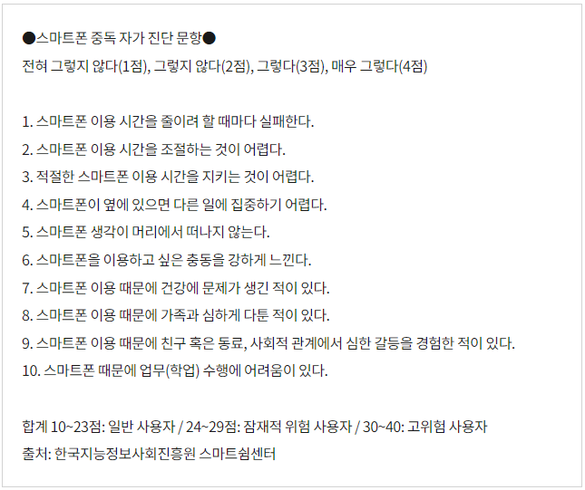 스마트폰 중독 테스트, 자가 진단 10가지 (자동 채점) 금욕상자건강 정보 2023. 8. 10. 22:08반응형