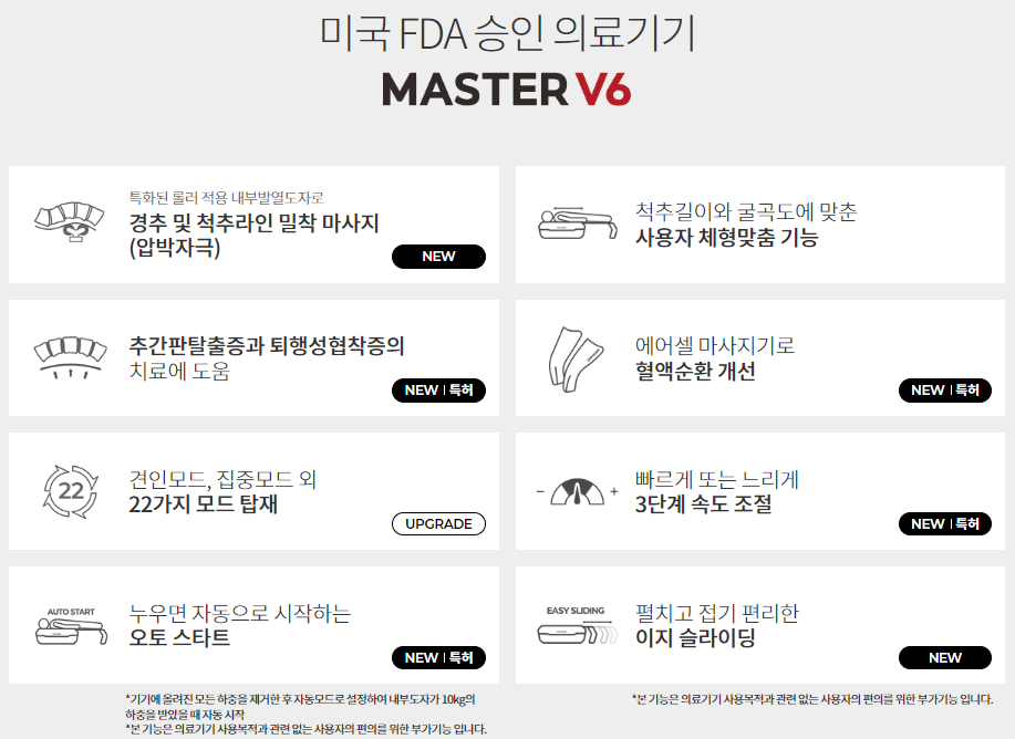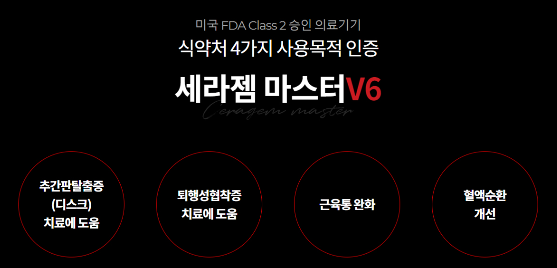 세라젬 v6 모델은 식약서 4가지 사용목적 인증을 받은 제품입니다. 추간판탈출증, 퇴행성협착증, 근육통, 혈액 순환 개선에 도움이 된다고 합니다. 추간판탈출증은 추간판이 돌출되어 요통 및 신경 증상을 유발하는 질환이며 퇴행성 척추 관협착증은 척추관이 좁아져서 다리로 가는 신경이 눌리기 때문에 나타나는 증상입니다.