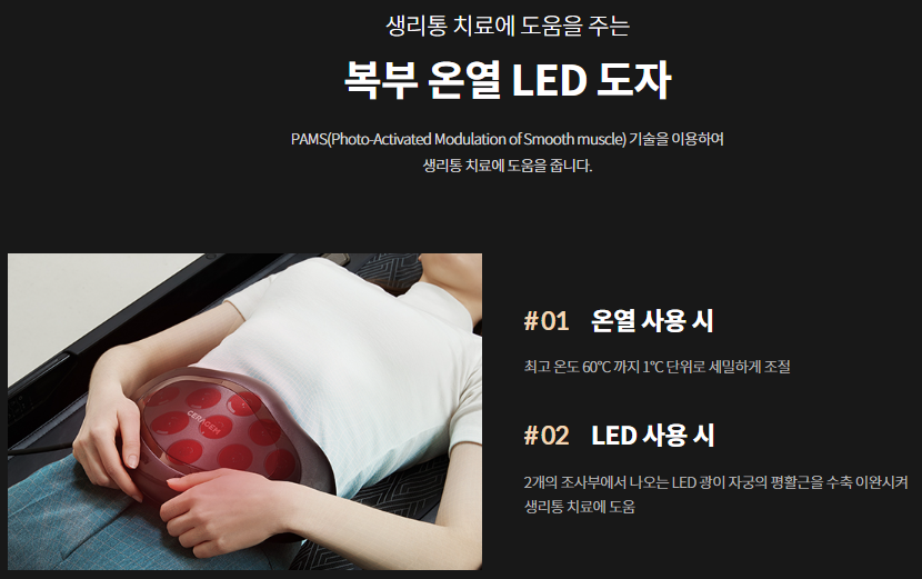 세라젬 의료기 v7은 식약처 인증 5가지 사용목적 인증을 받은 제품입니다. 추간판 탈출증 치료, 퇴행성 협착증, 근육통 완화, 혈액순환 개선, 생리통 치료 도움이 추가되었습니다. 복부 온열 LED 도자를 통해 생리통 치료에 도움을 주게 됩니다.
