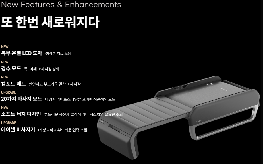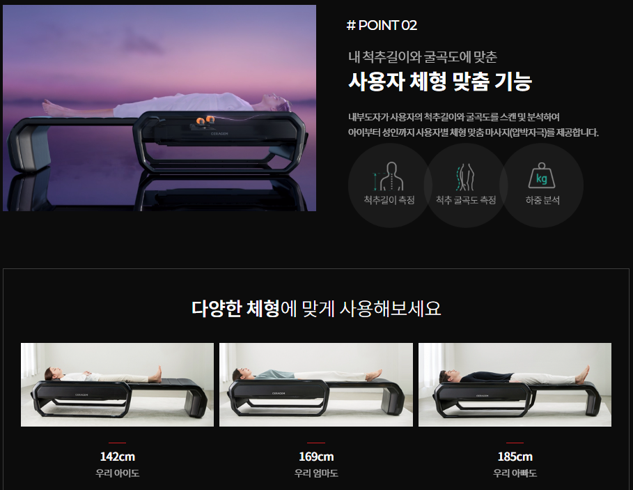 세라젬 의료기 v6 또한 세라젬 v6는 다양한 체형에 맞게 척추 길이 측정, 굴곡도 측정, 하중 분석을 하며 사용자 체형맞춤 압박을 받을 수 있겠습니다. 또한 제품 전체 온열구간이 적용되어 상체부터 하체까지 따뜻한 온열효과를 제공받아 근육통 및 혈액순환 개선에 도움이 되겠습니다.
