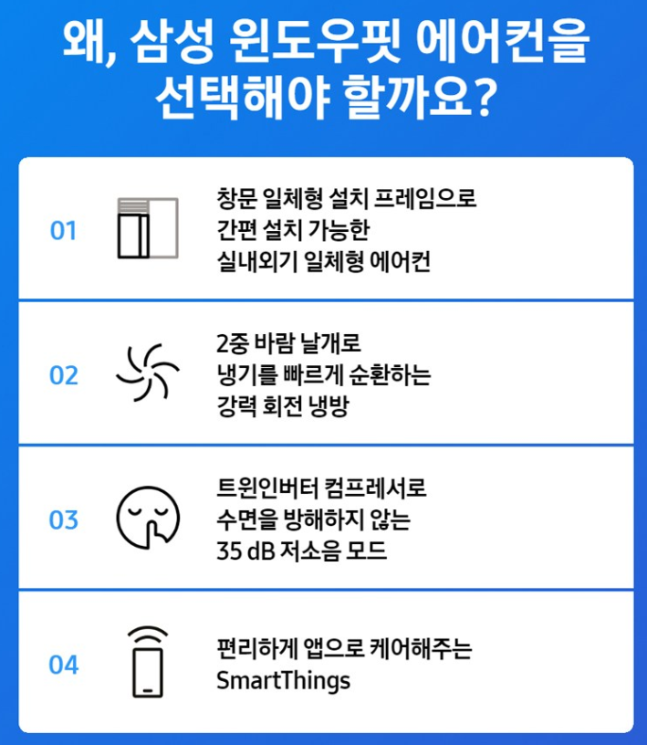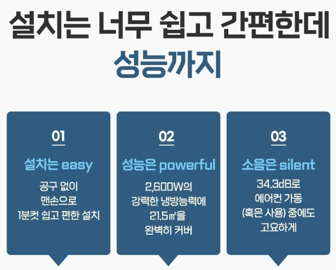 삼성 창문형 에어컨은 2중 바람 날개로 냉기를 빠르게 순환하는 냉방 방식으로 트윈 인버터 컴프레서로 수면을 방해하지 않는 저소음 모드를 가지고 있습니다. 탈부착이 간단해 방방마다 이동 설치가 가능하고 언제 어디서든 간단한 셀프 설치가 가능하죠.